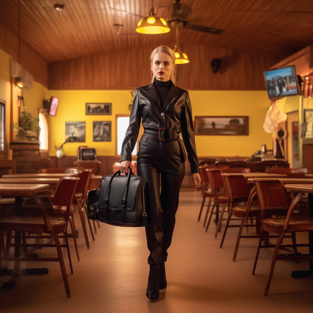 My first attempt on this one led to a scene that was more about characters discussing Tarantino’s films than acting like they were in one, so the text below was a second draft where I gave ChatGPT more specific instructions based on what I thought were the most salient characteristics of QT’s work.