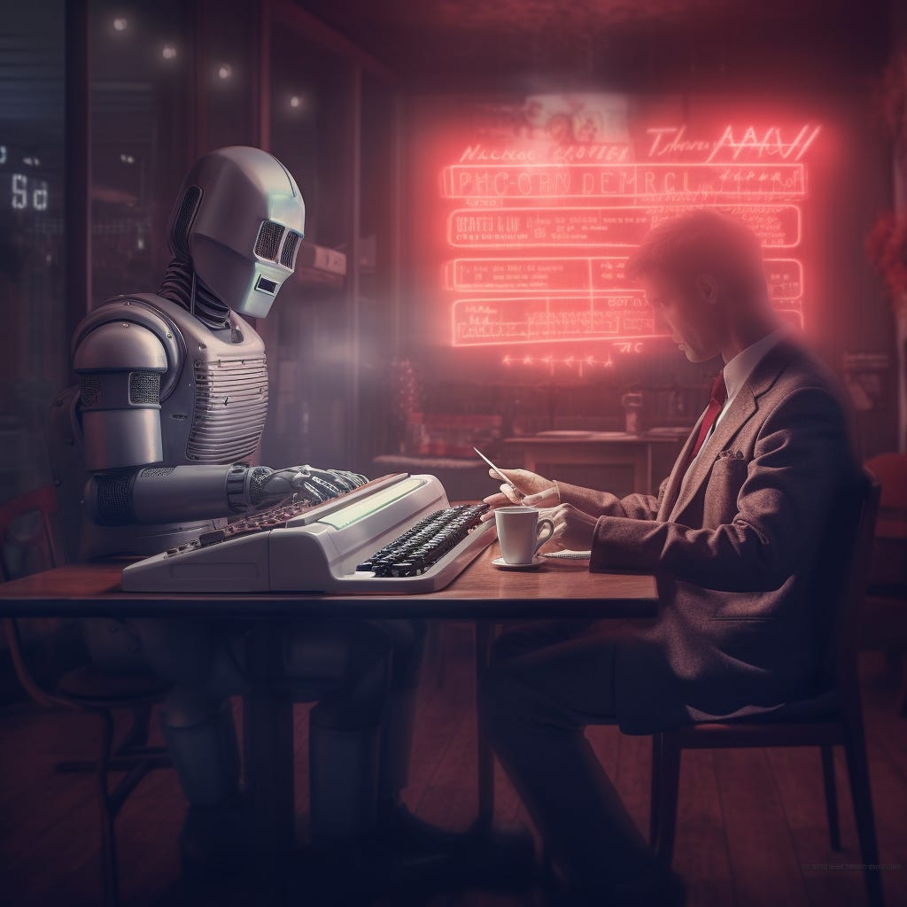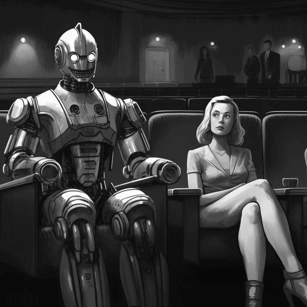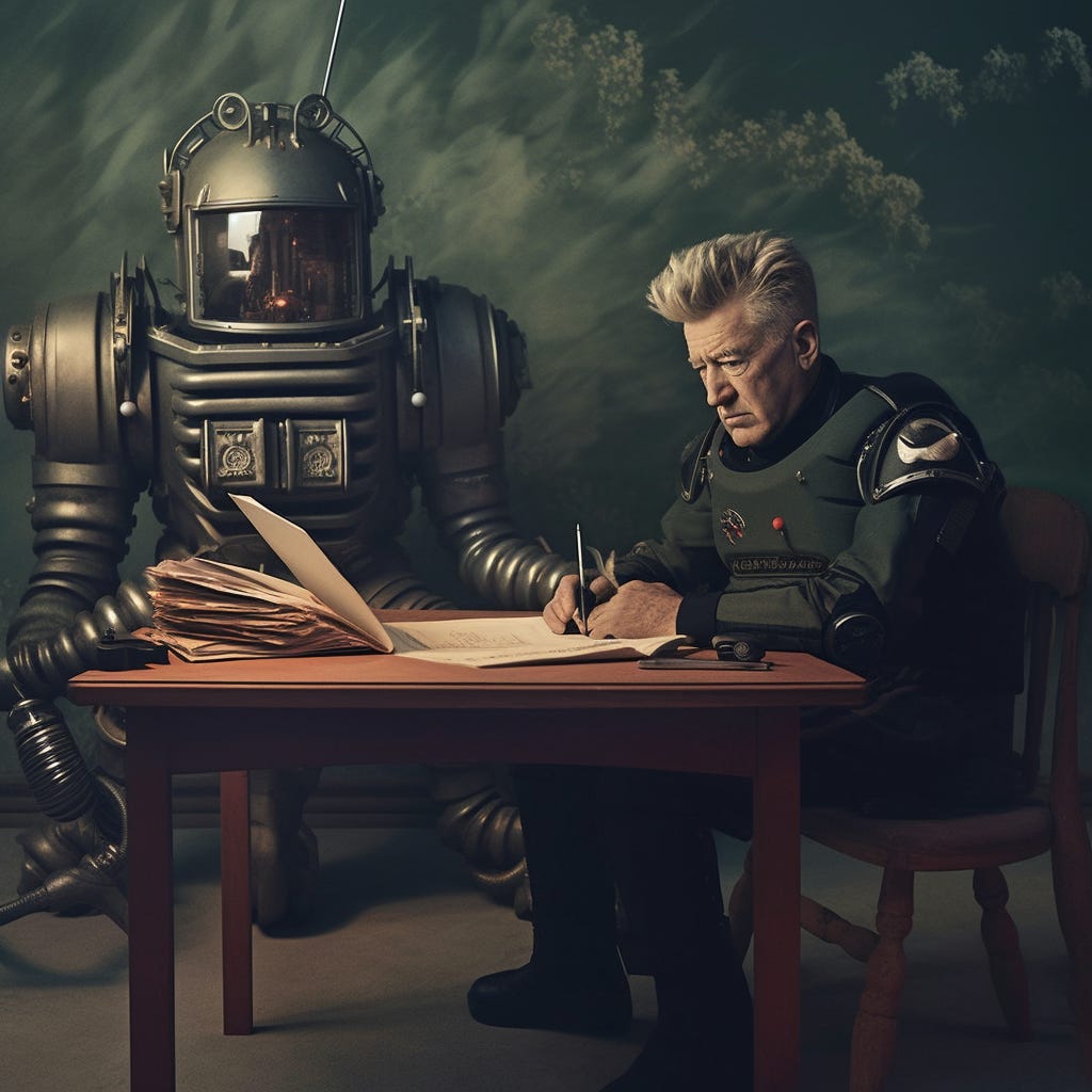 It seemed worthwhile, then, to see where we’re at in terms of AI-written scripts. To that end, I spent yesterday afternoon making a kind of 21st-century exquisite corpse with ChatGPT-4, the most advanced model OpenAI has released to the public. The idea was to have ChatGPT write a five-scene screenplay with each scene in the voice of a different writer and/or filmmaker. To keep things relevant, the story is set in a future where human screenwriters have been replaced by artificial intelligence. While I did have the chatbot rewrite two scenes (marked below), the text is otherwise unedited. If you’re interested, my commentary’s in the footnotes.