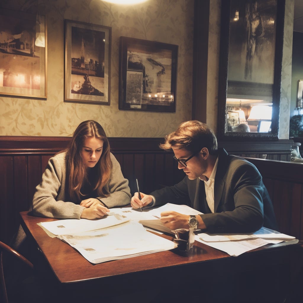 James is hunched over the counter, tinkering with an old typewriter, the clicking of keys echoing in the silence. Ruby, in a retro velvet chair, is surrounded by crumpled pieces of paper, a haunted look in her eyes.